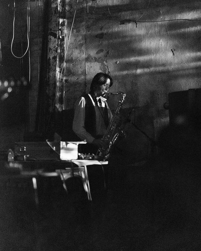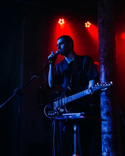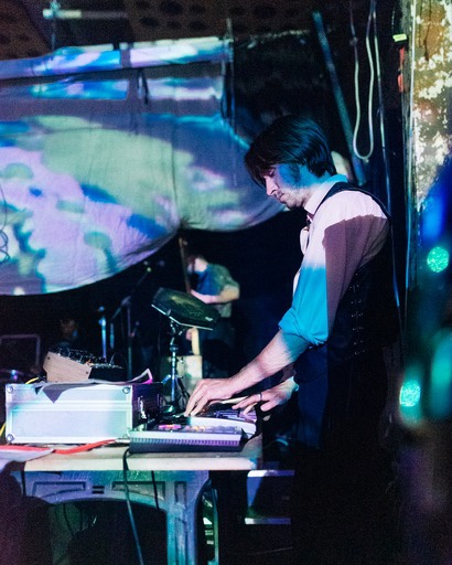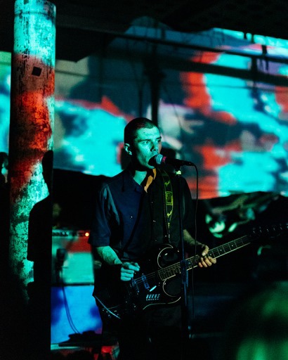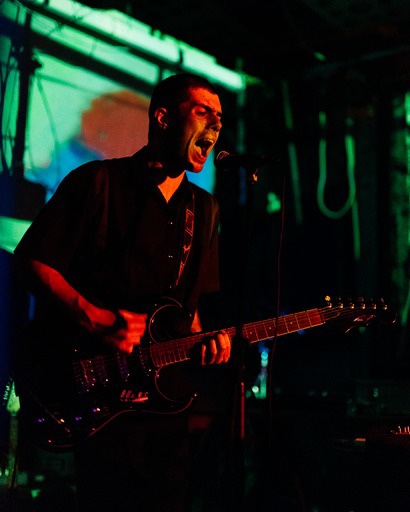 The band are daubed in green and blue tones from the visual projections which manifests an air of performative art, but also meant that Doss has to peek out, every now and then from behind a tarpaulin screen, while scudding the bass and the drummer is completely obscured for the entirety of the show.