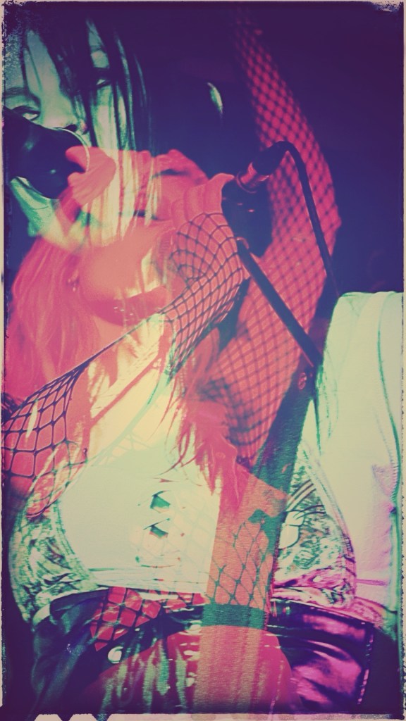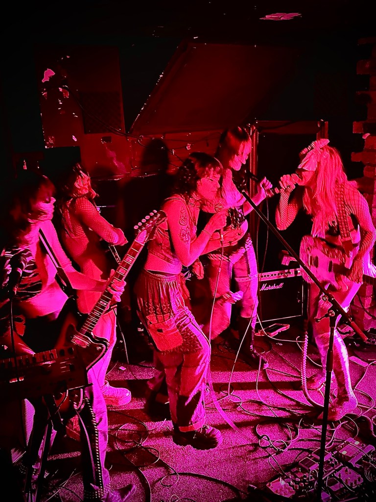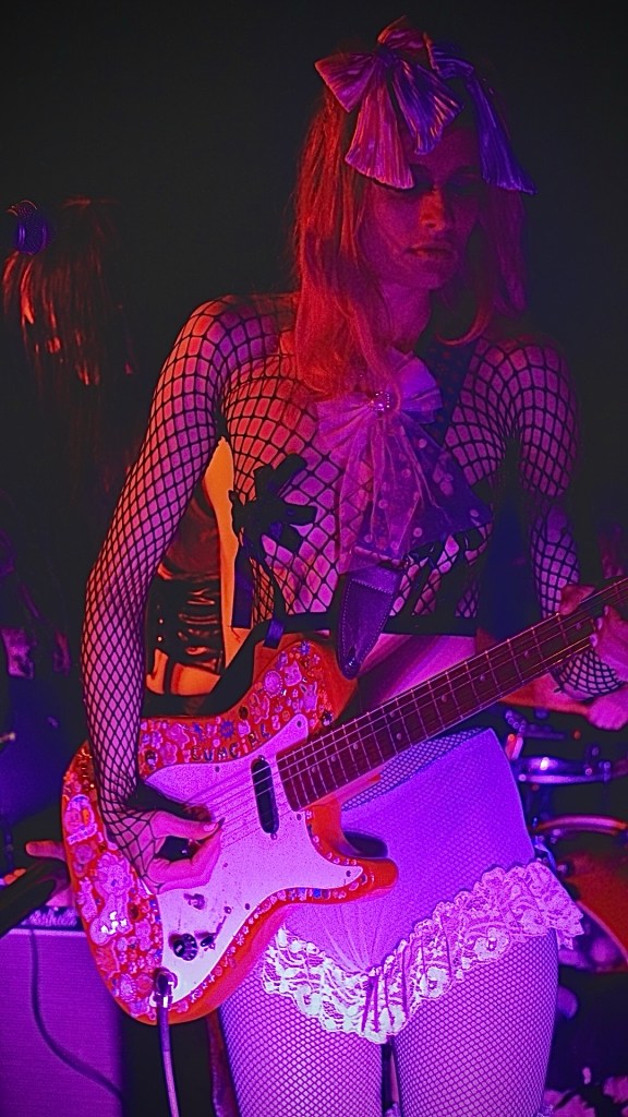 Each member of Cumgirl8 embodies an intoxicating mix of chaos and precision. Veronika Vilim, whose blonde locks glint like NYC’s neon gutters, swaps guitars for a candy-pink butterfly iPad programmed with glitchy digital beats. Lida Fox, on bass, is the band’s brooding metronome, pulling thick, rubbery lines straight out of a cyberpunk dive bar. Chase Lombardo the drummer with a banshee’s snarl, doesn’t so much play as summon storms. And then there’s Avishag Rodriguez, wielding her guitar like a machete, slicing through the noise with distorted riffs that feel like broken glass in a velvet glove.