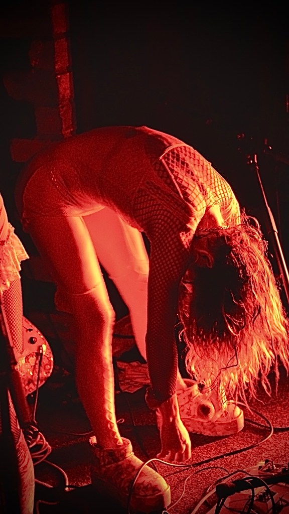Opening for the night were Glasgow’s finest new upstarts, Mélange, whose danceable punk riffs filled the room with head bopping glee, their final track, Psychosomatic, set the tone for the chaos to come. But it was Cumgirl8 who hijacked the evening, transforming the basement of The Hug and Pint into a seedy, shimmering riot of sound, satire, and subversion.