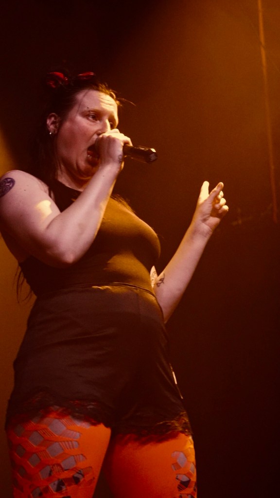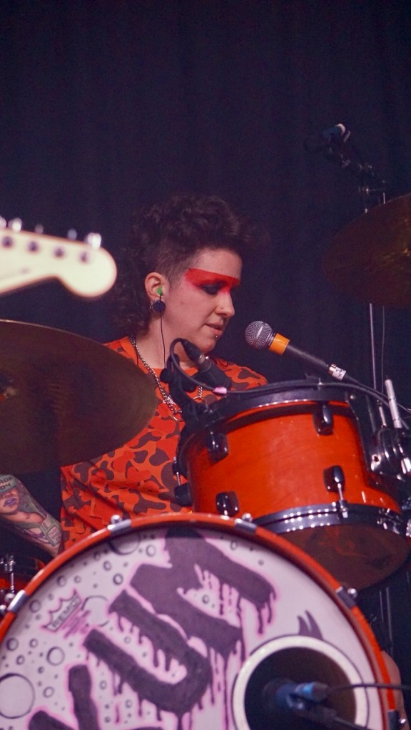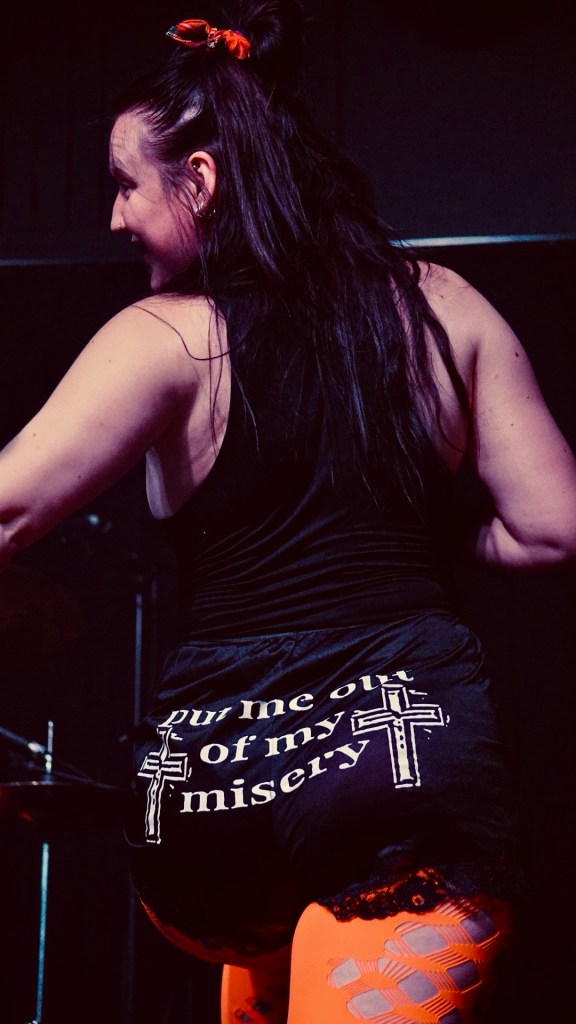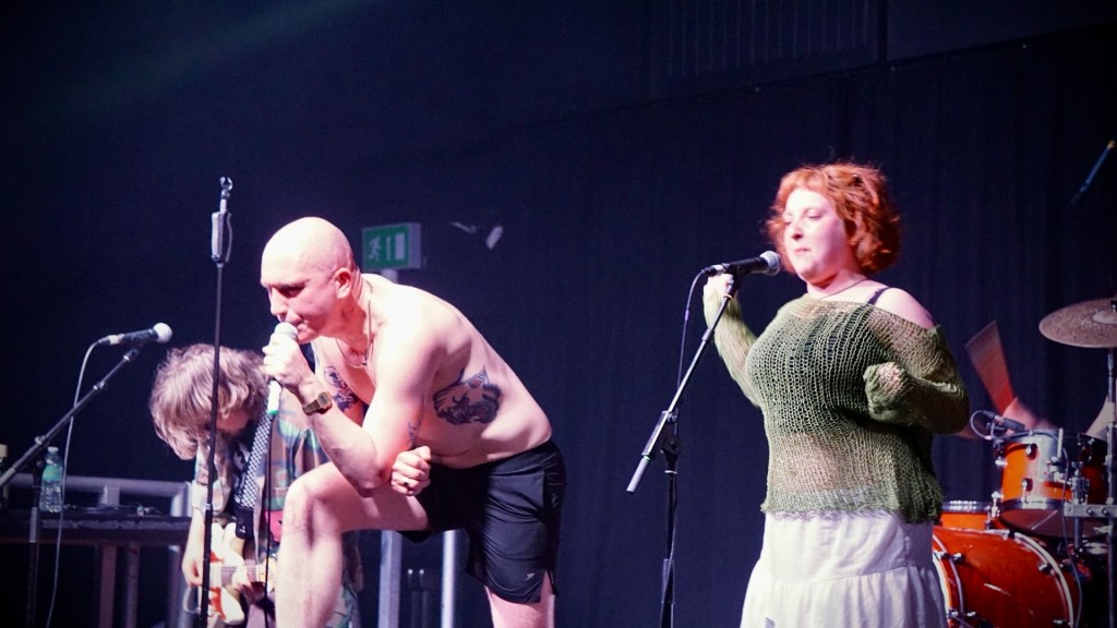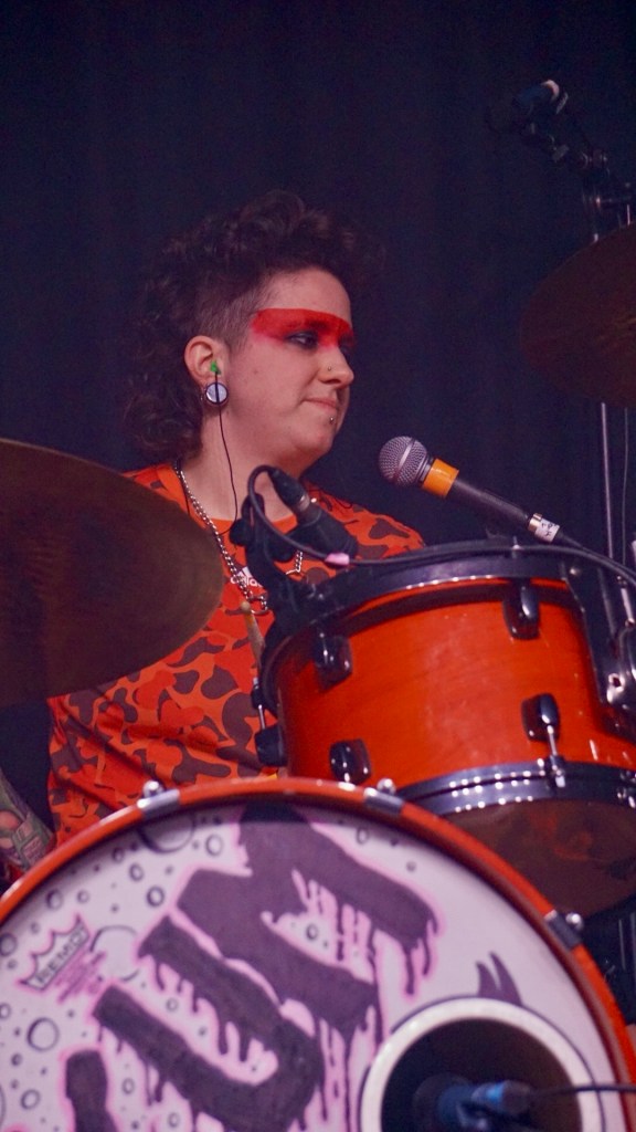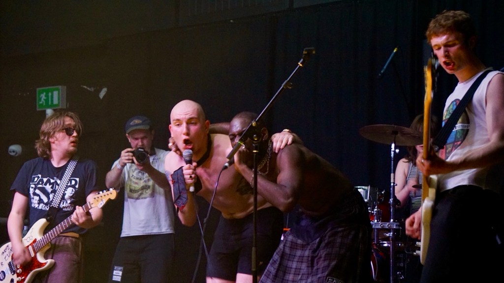 Then The Menstrual Cramps descended like a swarm of righteous wasps, buzzing with bile and political intent. Frontwoman Emilia Elfrida was a gyrating vision in satin hot pants that screamed “PUT ME OUT OF MY MISERY” across them, a slogan equal parts cry for help and battle cry. Their set was a glorious explosion of spit, glitter, and fury, taking aim at every institution complicit in the Israeli state’s genocide in Palestine. They weren’t just playing songs—they were stamping out apathy. Having spearheaded the campaign for bands to boycott The Great Escape Festival over its Barclays sponsorship, Emilia, alongside fellow members Carl (bass), Jenna (guitars) and AJ (drums), made it quite clear: complacency will not be tolerated. Their sound is like Bikini Kill being mugged by Amyl and the Sniffers in a pub toilet—raw, reckless, and delightfully unrepentant. Highlights included “Neo Nazi,” “Mutual Masturbation,” and “Hashtag Sad Penis,” each track a neon brick hurled at the glass house of polite society.