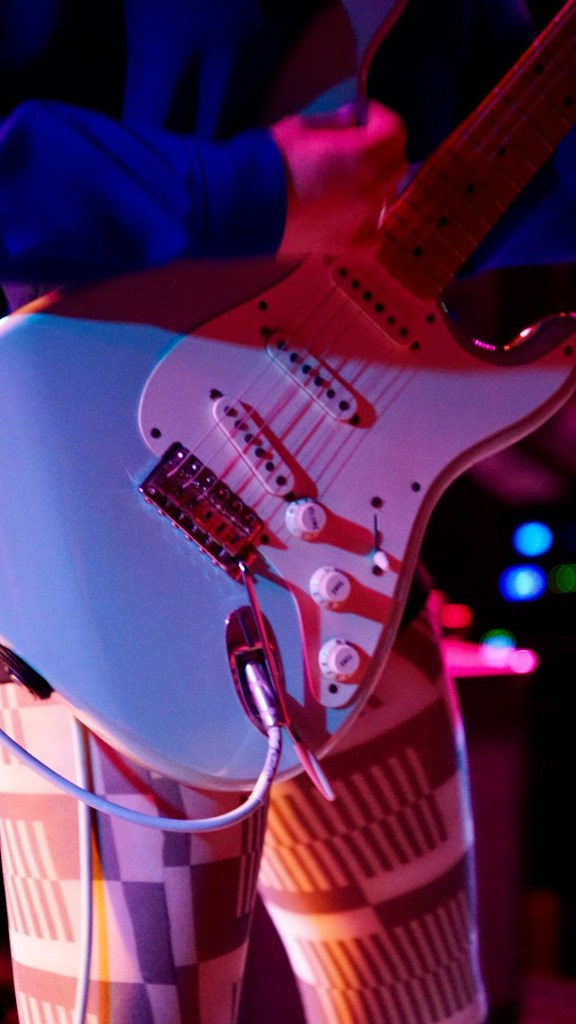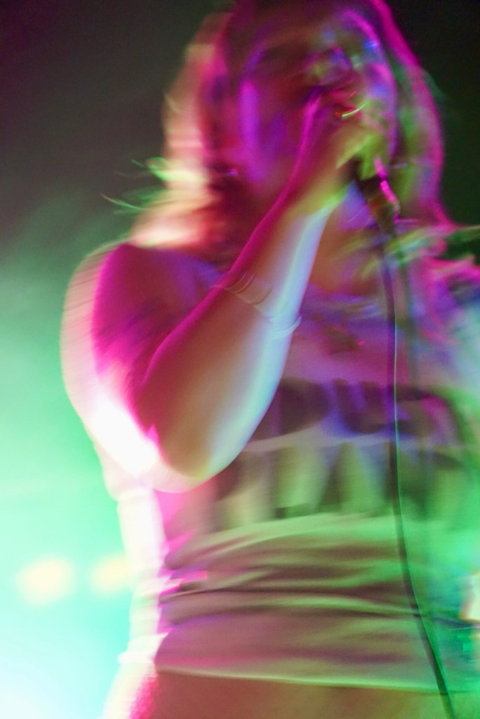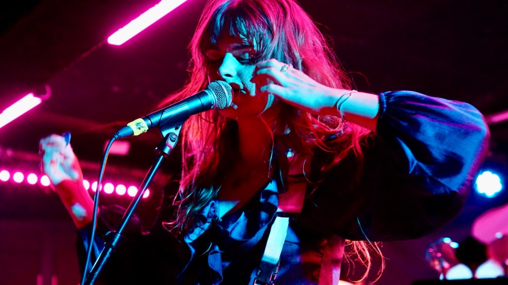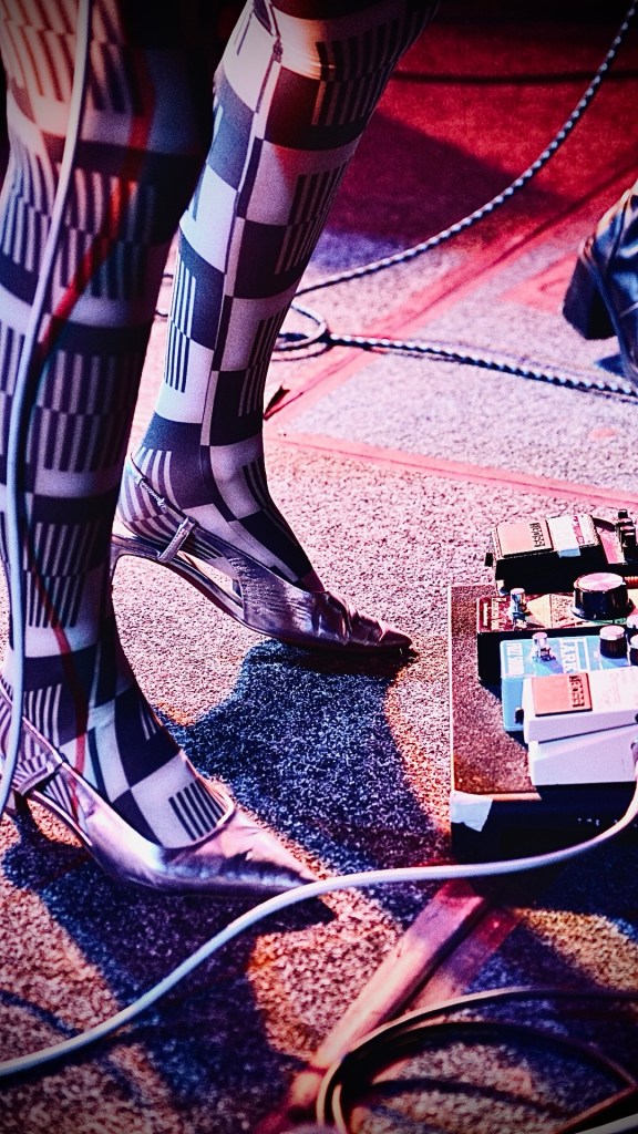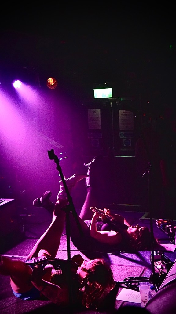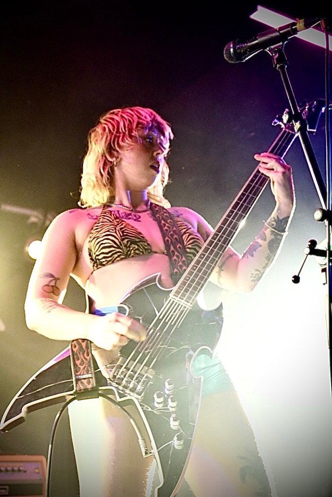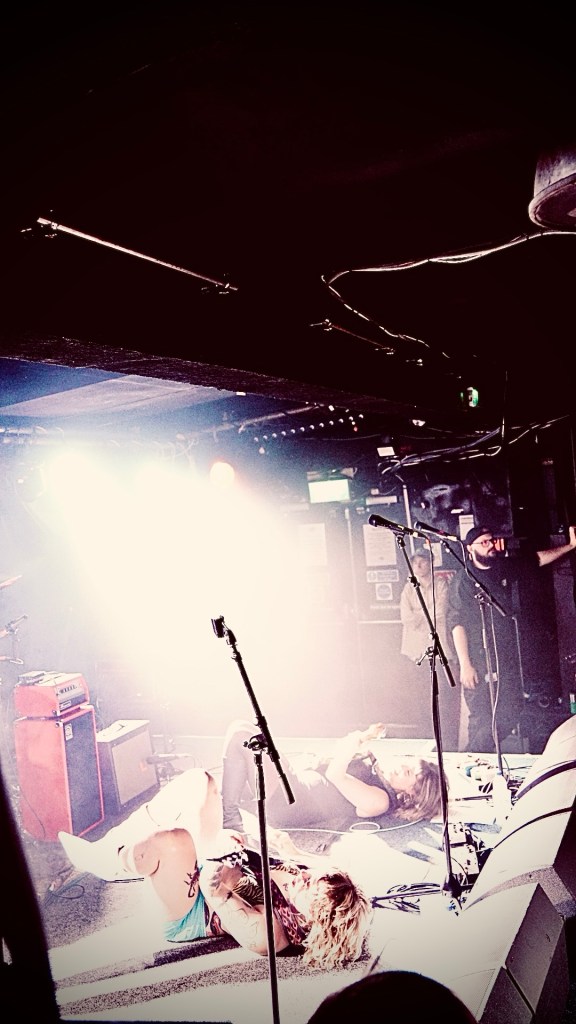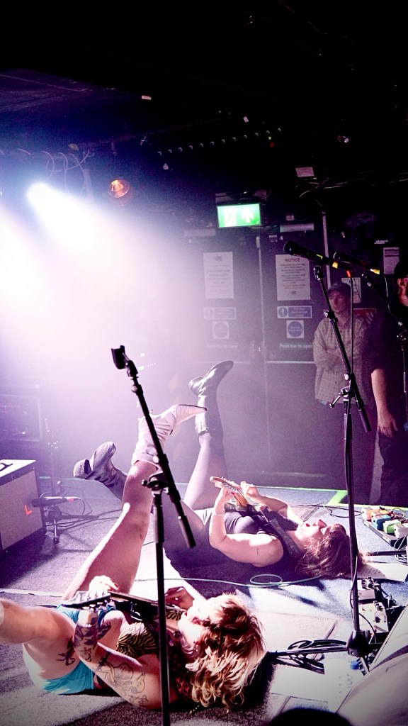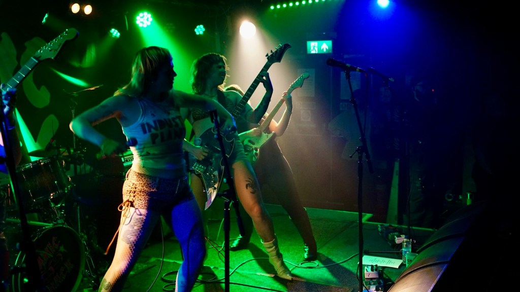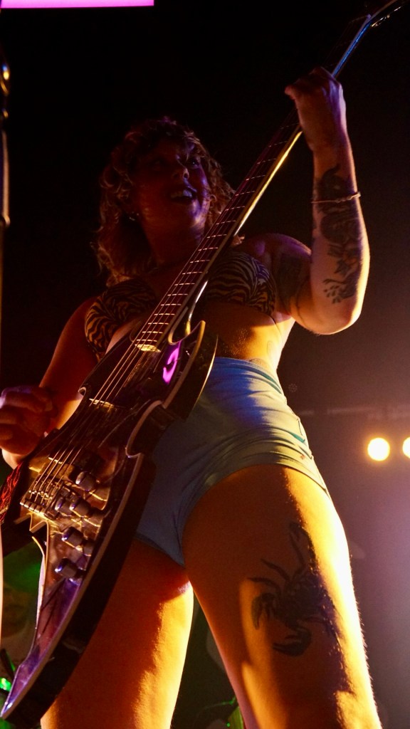 Their set kicks off with a song poking fun at Leonardo DiCaprio’s eternal search for youth — a biting commentary on online grooming masked in shouty one-liners and coordinated backbends. Yes, actual backbends. Lily Hutchings and Lottie Massey are the utter powerhouse front duo who have co-ordinated each of their perfectly timed guitar/bass shreds with high kicks and pirouettes. With Rufus Reader smashing out guttural percussion. Lottie announced the track (which we can’t seem to ID online) like Cher with a fringe and a beef with all men named Josh — snarls her way through internet tropes like a Buzzfeed listicle with brass knuckles.