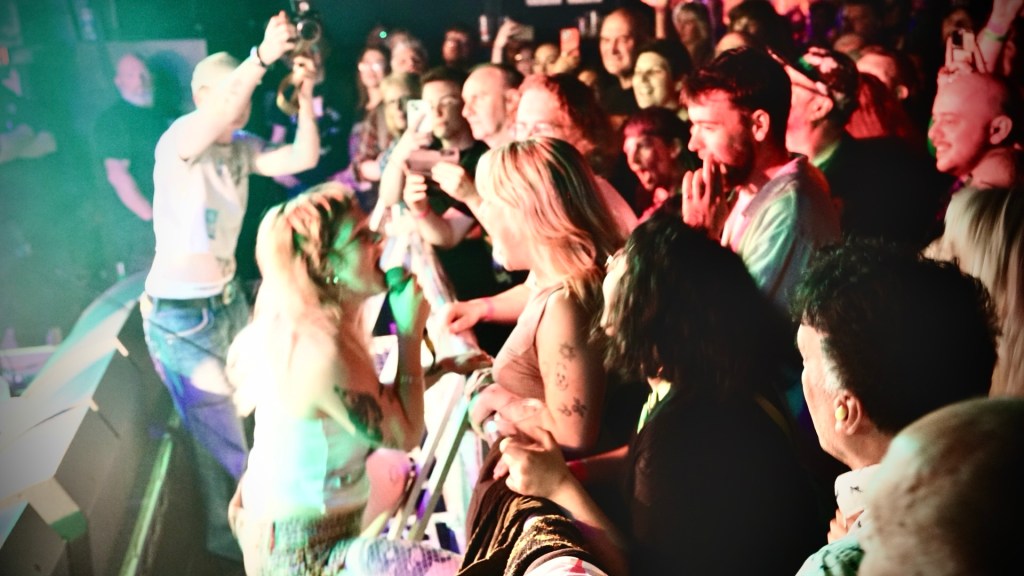 The crowd is asked if they can all “do a 360” — a move possibly invented on the spot or a fun bout of audience participation — but they oblige, in an ecstatic display of groupthink and irony. A fun prelude to introduce their song “Money Mullet” by first checking to see if there are any mulleted men in the crowd. There is. Apologies are made and assurances given that you are “probably really nice”, why? The song? A mullet anthem with dual vocals and a bassline so gargantuan it could flatten a Ford Fiesta. Think Wet Leg’s bratty cousin who got expelled from art school for writing diss tracks about her tutor.