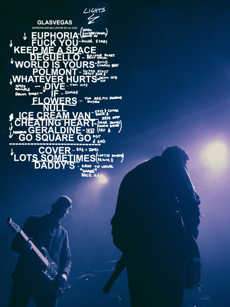 Launching straight into “Euphoria, Take My Hand”, Glasvegas set the tone for their Barrowlands return with a surge of intensity that immediately gripped the crowd. From there, frontman James Allan’s raw and emotional delivery took hold, while the band created their signature wall of sound around him. Rab’s shimmering guitar, Paul’s driving bass, and Chris’s crashing drums built a sonic backdrop that was both immersive and powerful, allowing James’ vocals to cut through with clarity and impact.