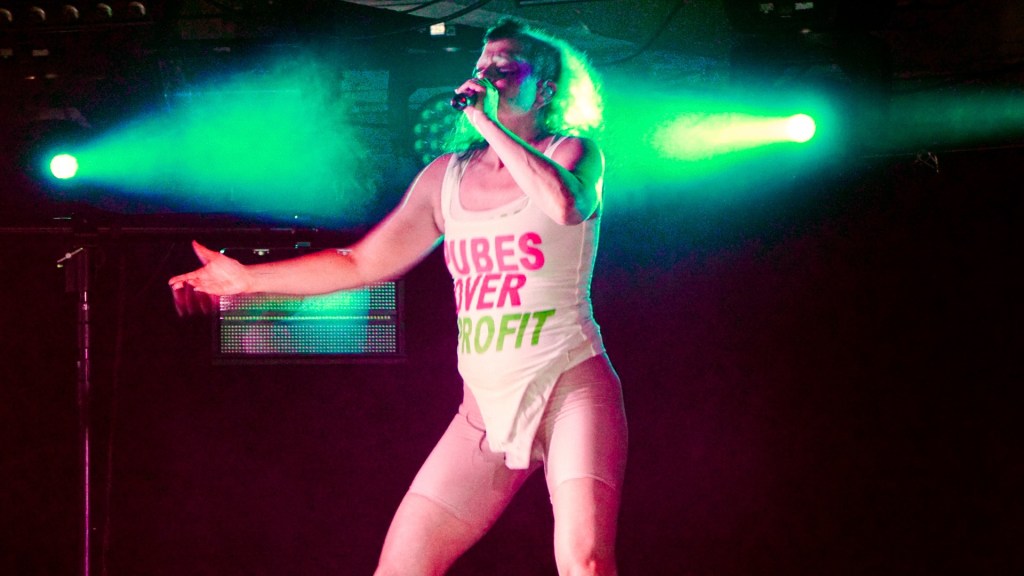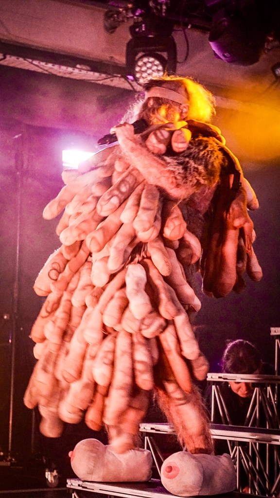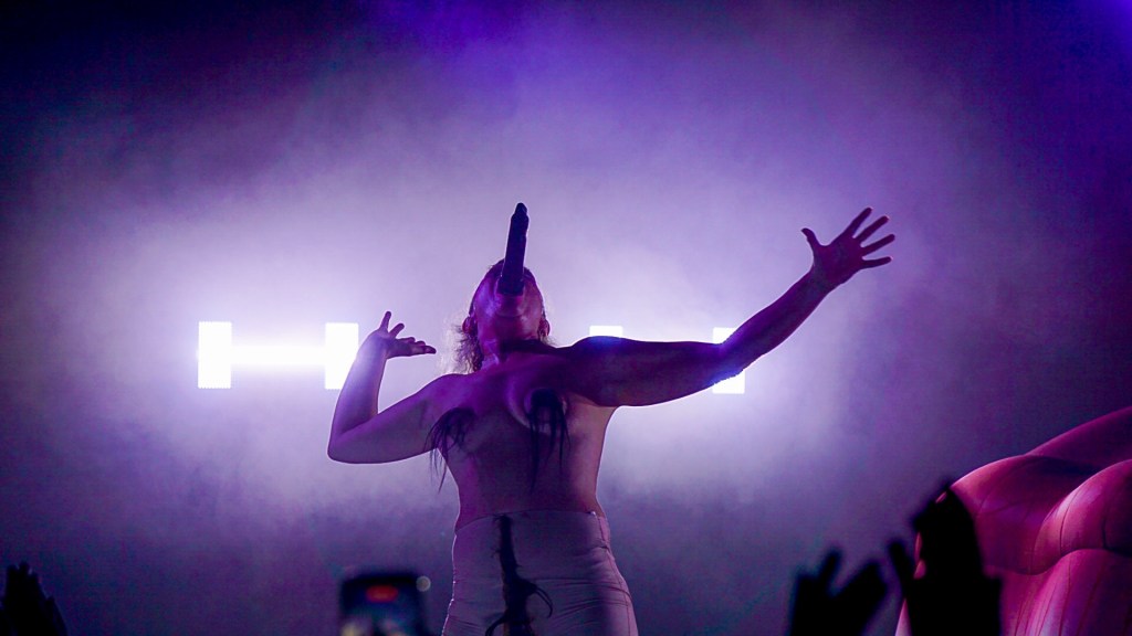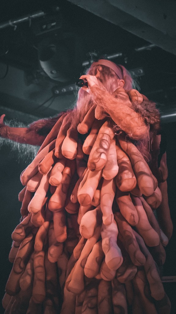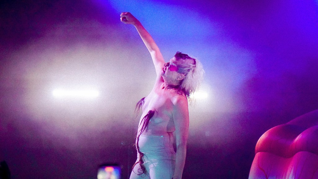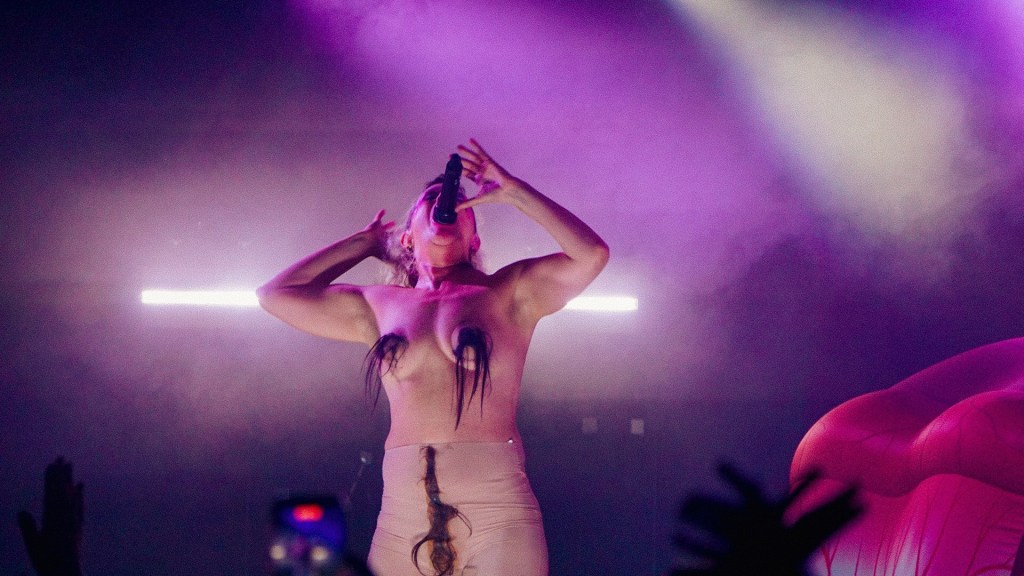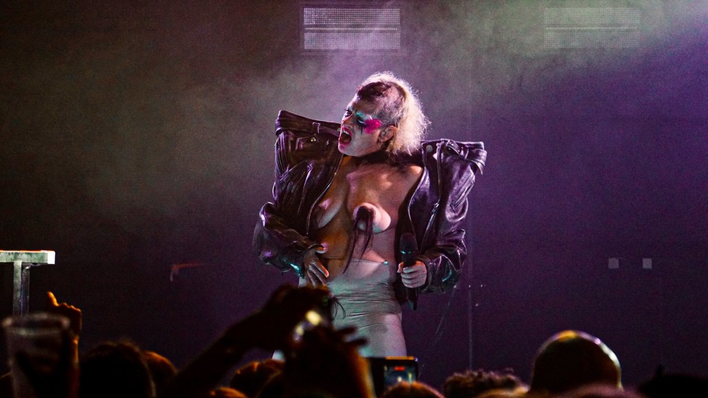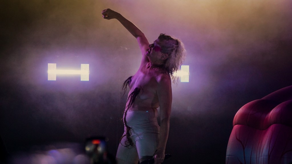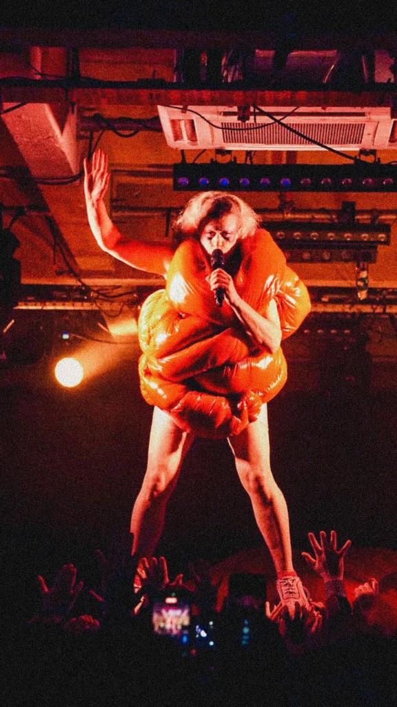 From the first bars of “Hanging Titties” into “Whatcha Gonna Do About It,” Peaches emerges less as a performer and more as a walking manifesto—encased in a grotesque, glorious boob suit, a kind of surrealist cluster of breasts that looks like it crawled out of a David Cronenberg daydream. It’s absurd, confrontational, hilarious. And then, because subtlety is not on the menu, she strips it off for “Rub” and reappears as a yeti, as if the night itself has decided to moult. Costume changes come thick and fast thereafter: bodysuits emblazoned with trans rights slogans and Free Palestine messaging, heavy breastplates, genderless silhouettes that refuse categorisation. Fashion here isn’t garnish—it’s argument.