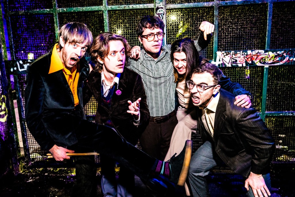 Rhian Teasdale, feather-light voice sharpened with sarcasm, is the band’s chaotic narrator. Hester Chambers, calm and deadpan on guitar, brings the melodic intelligence—her playing is all unshowy precision, the ballast to Rhian’s theatrical chaos. Henry Holmes on drums adds the backbone: punchy, unfussy rhythms with a post-punk snap that keeps even their silliest lyrics grounded. Ellis Durand on bass is the sly engine of the whole thing, giving their songs that propulsive bounce—lean, elastic, and just a little mischievous. Josh Omead Mobaraki, switching between guitar and keyboards, adds the atmospheric glue: shoegaze shimmer one moment, synth weirdness the next.