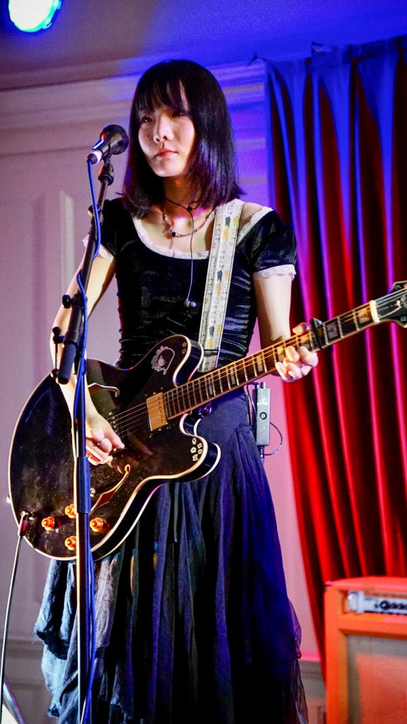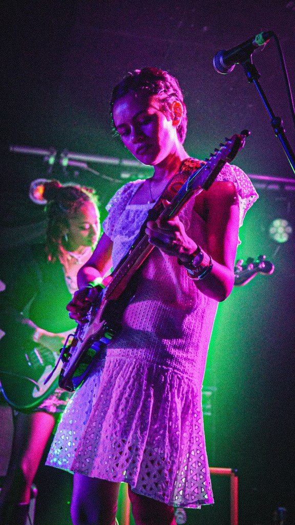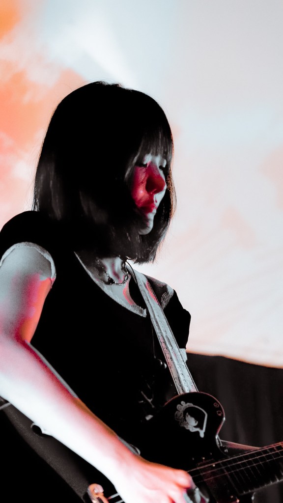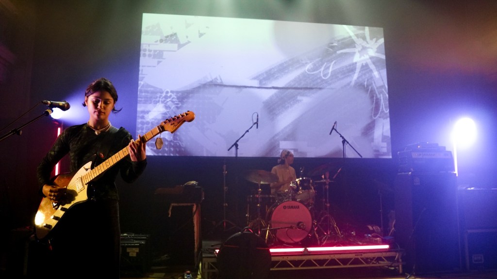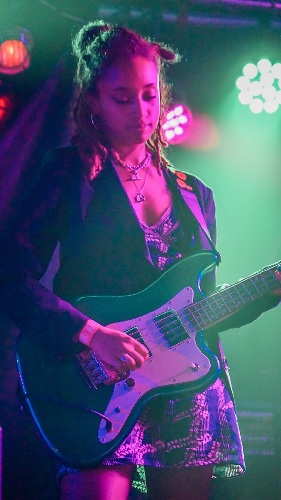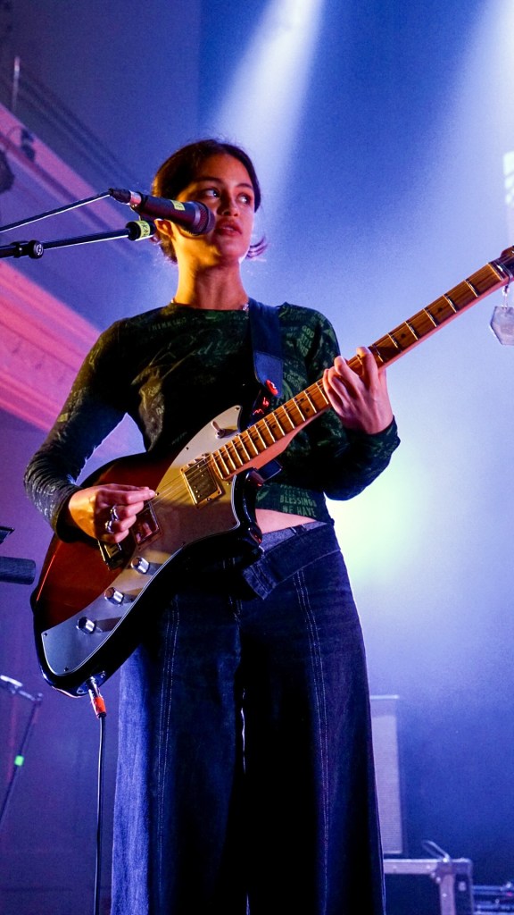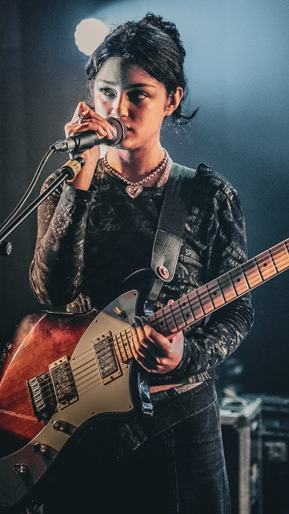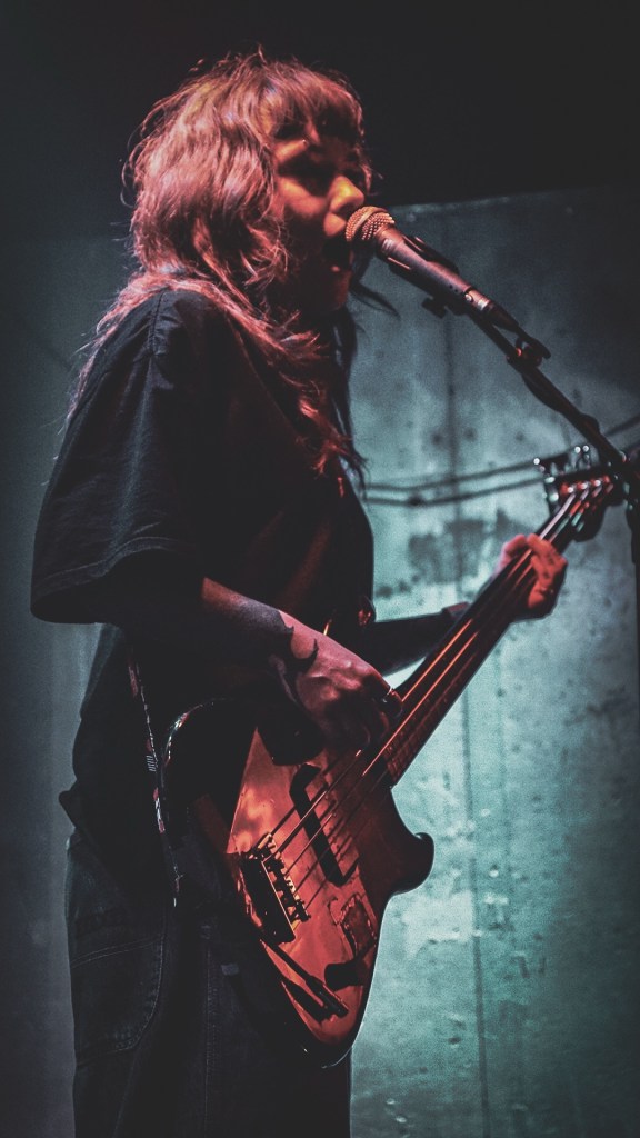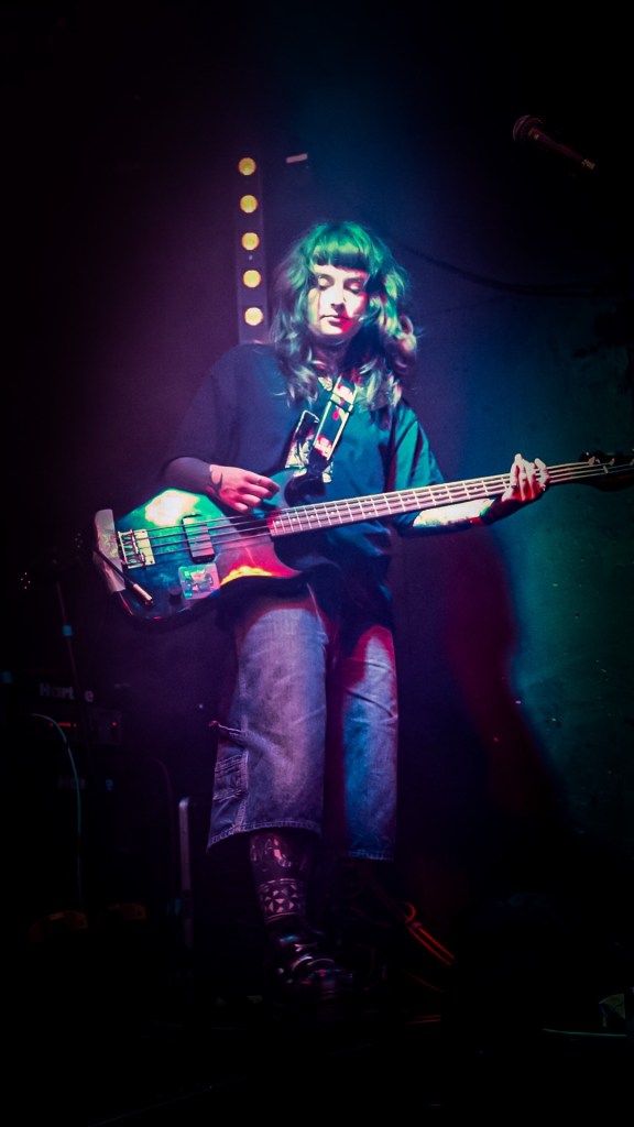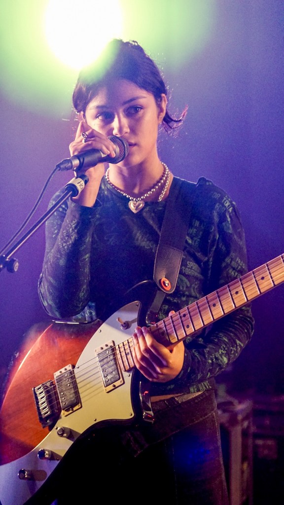 At Queen’s Hall, South London’s Honeyglaze turned the packed auditorium inside-out with lo-fi reverie and math-rock pulse, anchoring their sound in haiku-minimalism and post-punk scrawl. Their trio—Anouska Sokolow, Tim Curtis, Yuri Shibuichi—construct melodies that wobble like dominoes of emotion, melodic yet fractured, echoing English Teacher’s absurdity through a warped fun-house mirror. When their track “Pretty Girls” unfurled, that neon-tinged hook slithered through the crowd like honey laced with cyanide.